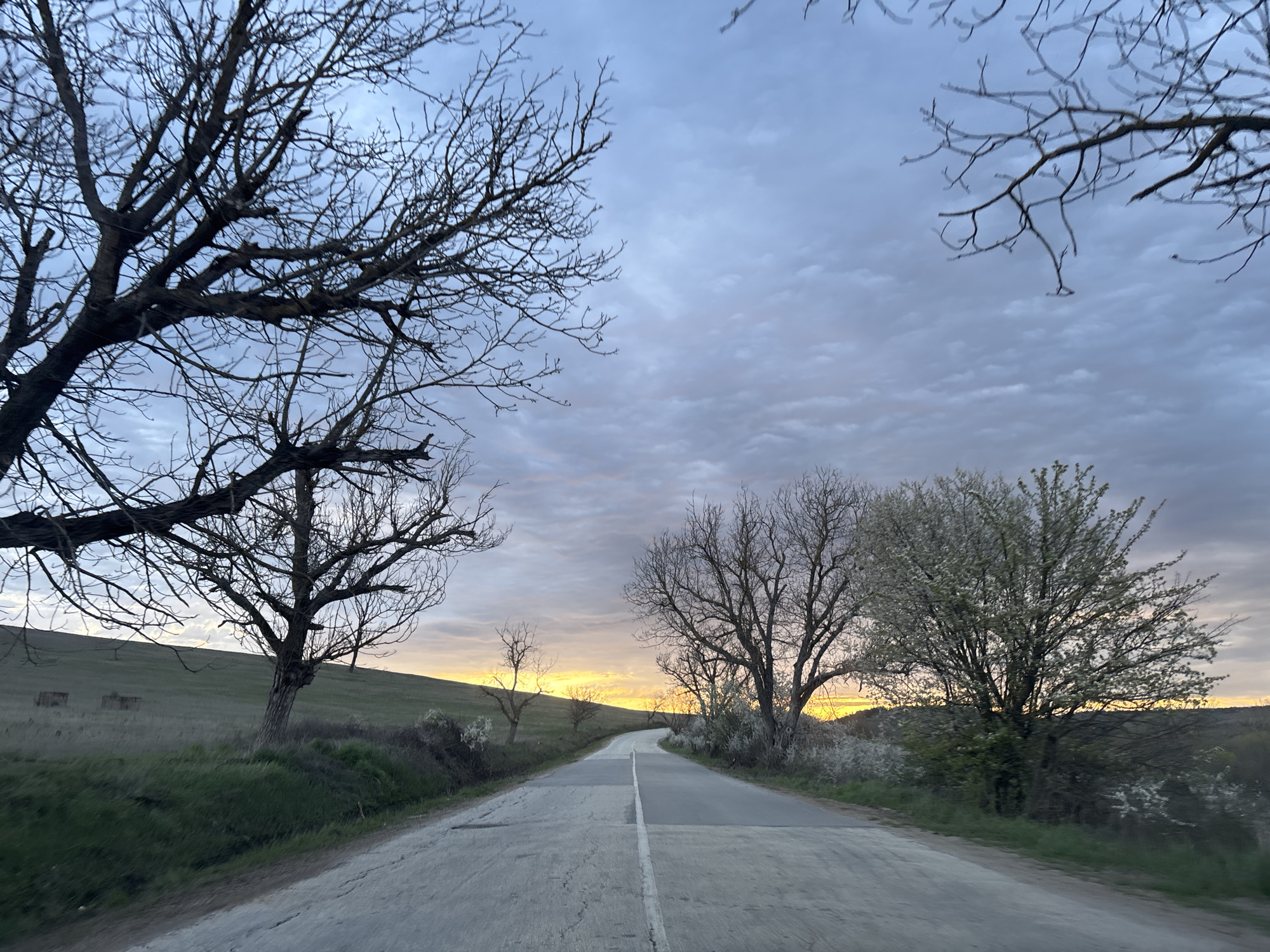 The image depicts a cracked asphalt road with a single white dividing line running through it. The road leads uphill toward the horizon. On either side of the road are fields with trees. Some trees are bare, while others have white blossoms. The sky is overcast with a yellow-orange glow on the horizon. The location is Suhache, Bulgaria.