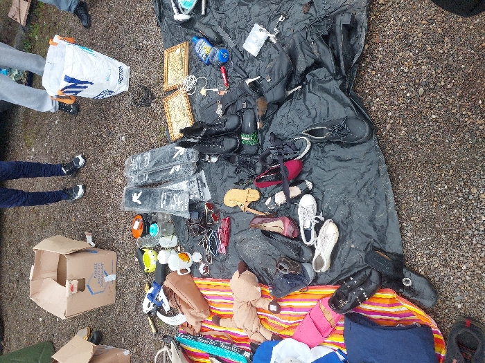 The image captures an overhead view of an outdoor market stall in Eckbolsheim, France. The scene is set on a ground composed of small gravel. A large, dark-colored tarp is spread on the ground, serving as a display surface for various items. On the left side of the tarp, a multicolored striped blanket supports a light brown plush toy and folded clothing items in pink, blue, and white. Adjacent to these are a brown handbag and multiple pairs of footwear, including black patent leather loafers, black lace-up shoes, white sneakers, red flats, brown heels, and cream/yellow flats. The central area of the tarp displays an assortment of sunglasses, various mugs and cups (white, yellow, green, clear), a small orange container, and several black items in plastic packaging, some branded with a stylized "R" and "Playboy" logo. A stack of black boots is also present. On the right side of the tarp, two gold-framed pictures with ornate designs, a tangled white cord, a blue plastic bottle, a small red flashlight, and additional black clothing items or bags are arranged. In the background, positioned directly on the gravel, are two cardboard boxes; one is open and partially flattened, displaying visible French text. A white plastic shopping bag with the "ACTION" logo stands upright. The lower legs and feet of at least three individuals are visible, suggesting their presence around the stall. One person wears dark athletic pants and black-and-white sneakers. Another wears light gray sweatpants and dark sneakers. A third person's feet, clad in black shoes, are partially visible on the far right.