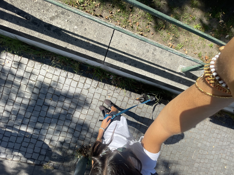 A high-angle photograph captures a scene on an elevated pedestrian pathway in Porto, Portugal, under bright sunlight. A person, viewed mostly from behind, with long dark hair, wears a white short-sleeved top, dark bottoms, and dark sneakers. They hold a teal/blue leash connected to a small, dark-colored dog, possibly a dachshund, wearing a dark harness and sniffing the ground. The pathway is constructed of grey cobblestones (calçada portuguesa) and features dappled shadows from unseen overhead structures. To the right of the path, a narrow strip of grass and weeds separates it from a grey concrete barrier or wall. A dark green metal railing runs along the top of this barrier, casting distinct vertical shadows on the concrete. Beyond the barrier and railing, a lower area of natural ground with grass, dirt, and dry leaves slopes downwards. In the immediate foreground, a tanned forearm and hand, belonging to the photographer, wears a gold-colored chain bracelet and several beaded bracelets (white and brown/orange).