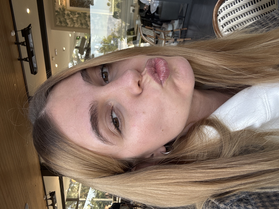 An adult female, appearing in her twenties, is captured in a close-up selfie, looking directly at the camera