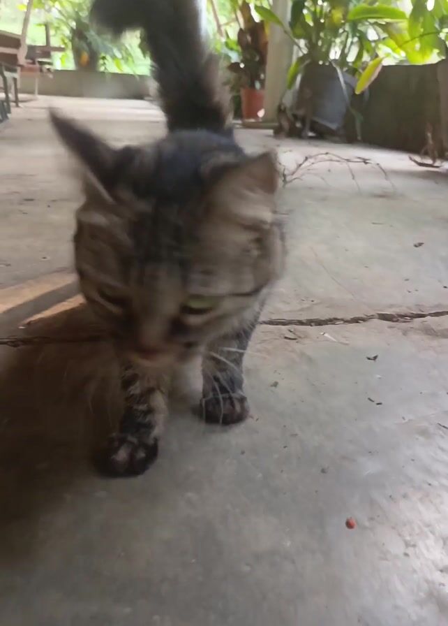 medium-sized tabby cat standing on a concrete floor. The cat faces the camera with its head slightly lowered, then moves to the left and walks past the camera. The background shows potted plants on a porch.