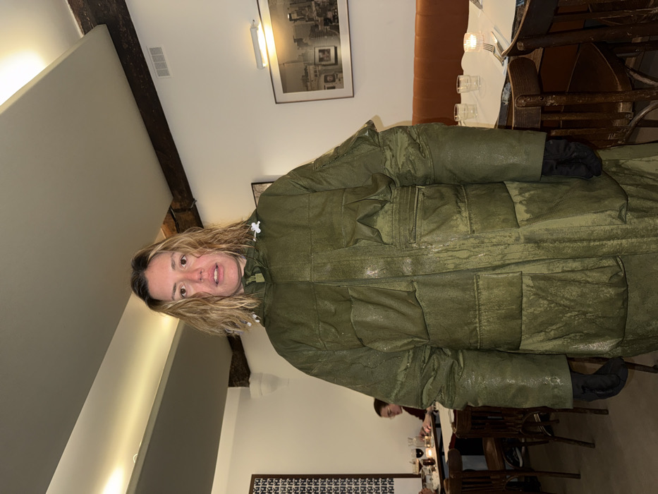 A person in a large, green, parka-style coat stands indoors. The person is looking towards the camera. The coat has several pockets and is shiny as if wet. Black gloves are visible on one of the sleeves. The scene includes restaurant elements such as tables, chairs, and settings, and there is another person seated at a table in the background. The camera angle is slightly tilted, and a black-and-white city skyline picture hangs on the wall.