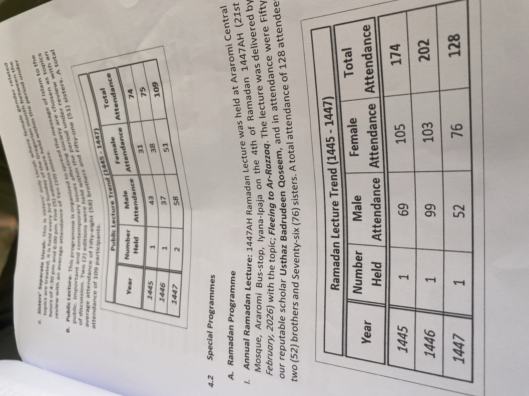 documentation related to special Ramadan programs, including public lectures and annual Ramadan lectures, held by an organization in Nigeria. One specific event detailed is the Annual Ramadan Lecture for 1447AH, which took place at Araromi Central Mosque, located at Araromi Bus-stop, Iyana-Ipaja. This location is within the city of Agege. The lecture focused on the topic "Fleeing to Ar-Razzaq," and was delivered by Usthaz Badrudeen Qoseem. The document provides attendance figures for these events, breaking them down by year (1445-1447) and gender. For the annual Ramadan lecture, 52 brothers and 76 sisters attended, resulting in a total attendance of 128.