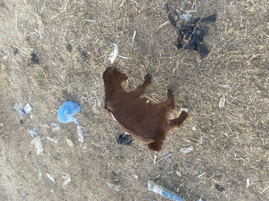 - "A brown goat lies on dry grass littered with trash" by FM-4rqhK2, licensed under CC BY 4.0