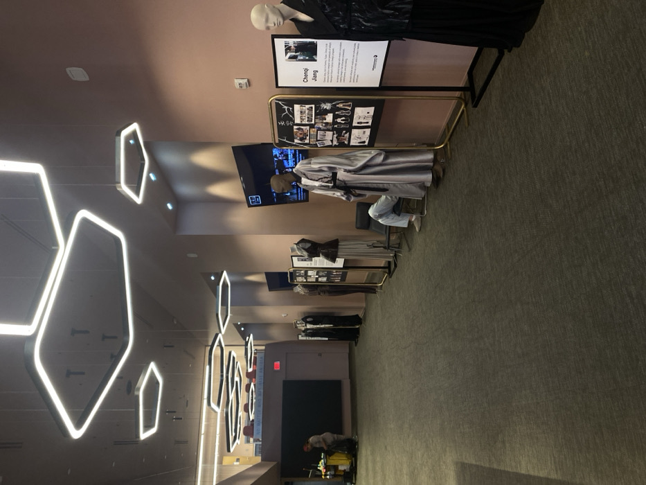 An indoor view displays a hallway with an exhibition of clothes