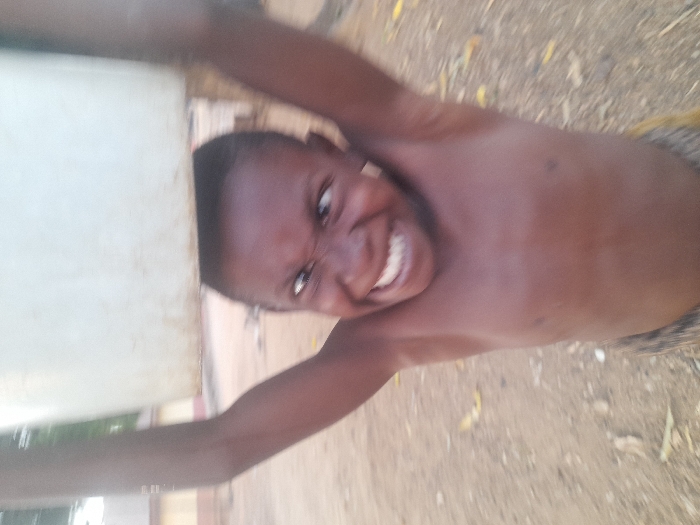 The image depicts a young, shirtless child of apparent Nigerian descent within the city of Akwanga, Nigeria. The child, estimated to be between five and ten years old, is positioned centrally, facing the camera with a wide, strained grin, bared teeth, and eyes squinted and crossed, looking to the viewer's left. A light-colored, rectangular plastic container or bucket is balanced on the child's head, held in place by both arms extended upwards. The child's bare torso is visible, showing clear skin. The lower body is partially obscured but suggests patterned fabric. The ground beneath the child is dry, light brown dirt with scattered small debris or leaves. In the out-of-focus background, indistinct structures with light-colored walls and sparse foliage are visible. The scene is illuminated by natural light, and the overall image exhibits motion blur, particularly around the child's moving limbs and the background.