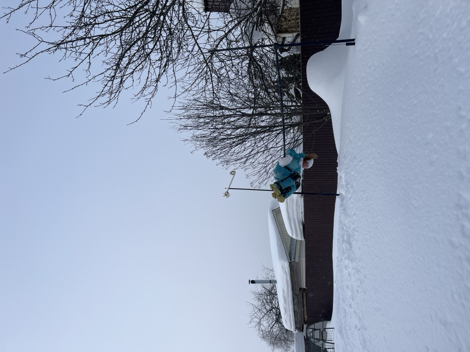 The image captures a snow-covered residential backyard in Italmas, Russia, under an overcast sky. A single individual, appearing to be a child, hangs upside down from a dark metal horizontal bar. The individual is dressed in a light blue/teal jacket, possibly a white hat or hood, and yellow/lime green boots. Their head and hair are oriented downwards. The ground is entirely covered with a thick layer of undisturbed white snow. Snow also heavily blankets the roofs of visible buildings and forms a substantial, rounded snowdrift behind the horizontal bar. A dark brown privacy fence extends across the mid-ground. In the background, to the left, a building with a gabled, snow-covered roof and a chimney is present. To the right, a section of another building is partially visible behind several bare deciduous trees. The scene indicates a winter environment.