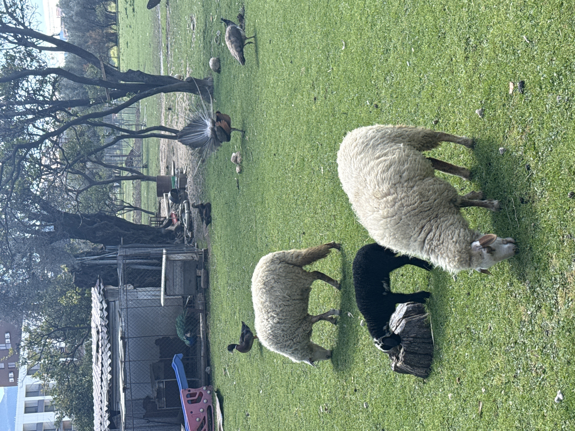 green grassy field, likely a park or pasture. Two adult sheep with thick white wool are grazing. A black lamb is seen near a tree stump. In the background, there are several fowl, including peacocks and chickens, suggesting an area where animals are kept. There's a fenced enclosure to the left, possibly for the fowl. A blue and pink plastic children's slide is also present next to the fenced area. In the far background, trees are visible, along with buildings suggesting a city location, likely in the city of Bar, Montenegro.