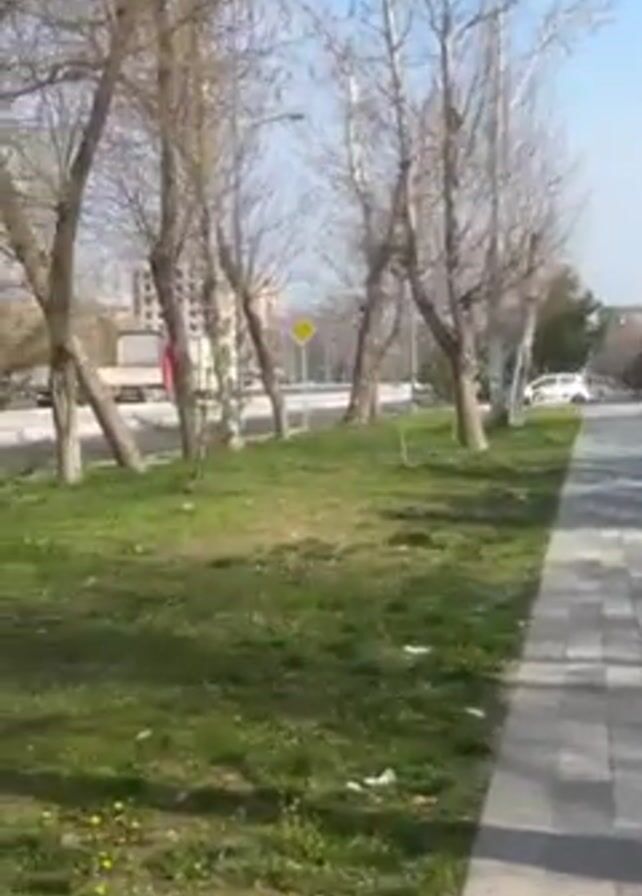 The video depicts a paved sidewalk in a public park or green space, likely in a city or town