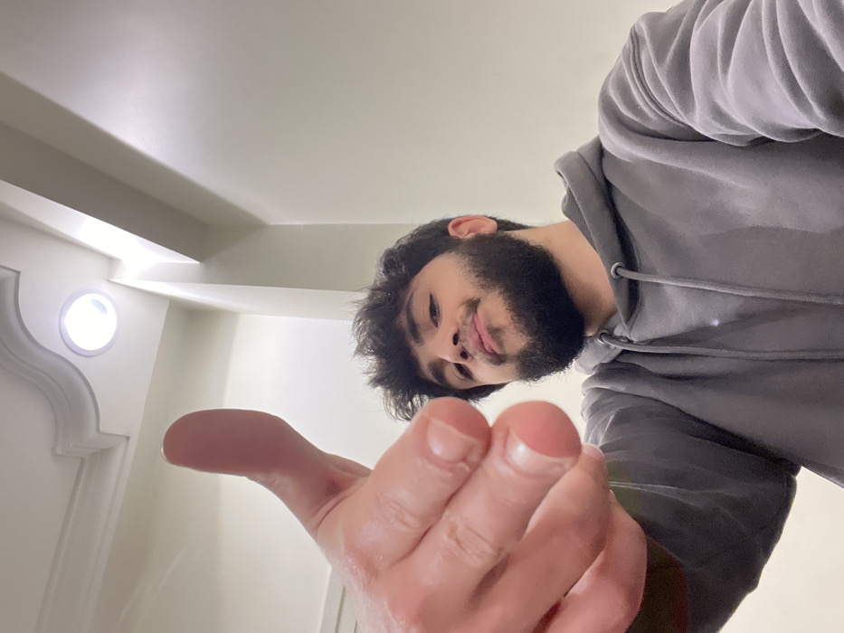 A person with a dark beard and hair peers down into the camera, their face slightly angled