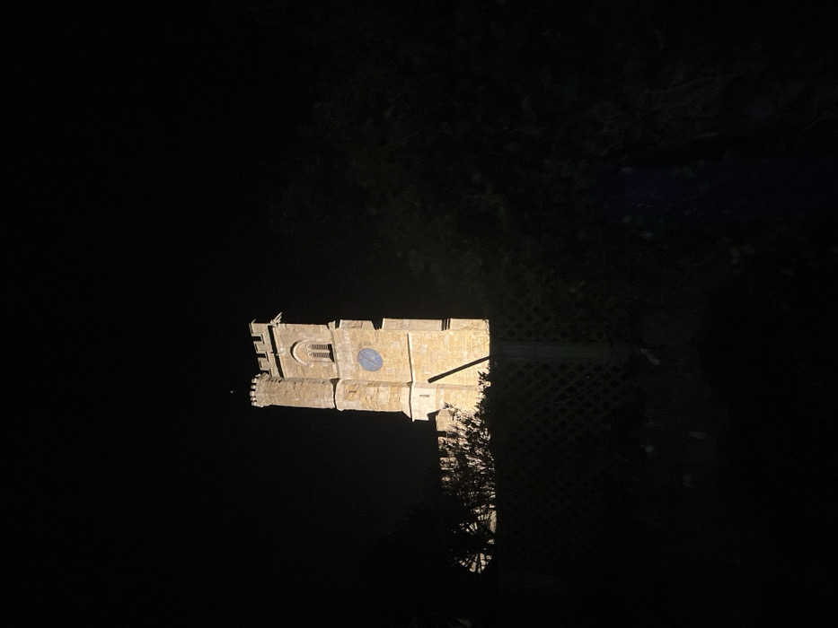 A low-angle shot depicts a lit medieval stone building at night. The structure features a clock and arched windows. Dark foliage surrounds the building, with a trellis-like fence visible on the right side. The building is lit with a warm glow and stands in stark contrast to the deep black sky and surrounding darkness.