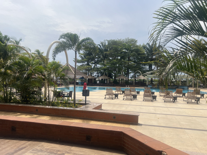 The image depicts an unoccupied outdoor swimming pool area located in Itirin, Nigeria, under a bright, partially cloudy sky. In the foreground, a multi-tiered planter wall constructed from reddish-brown brick and lighter-toned pavers supports lush green tropical foliage, including several small palm trees. Beyond this, a large, blue-water swimming pool is centered within a light-colored paved deck. Approximately 15 or more wooden lounge chairs, each paired with a small, dark side table, are arranged in rows around the pool. To the left of the pool, additional dark chairs and tables are positioned under thatched-roof gazebos. A red fire hydrant and a dark grey waste bin stand adjacent to the pool's edge on the left. Prominent white, curved arch structures span parts of the pool area in the midground, while more thatched-roof pavilions are visible further back. A dense line of trees forms the background, with a discernible body of water, likely the ocean, visible faintly beyond them. No individuals are present within the scene.
