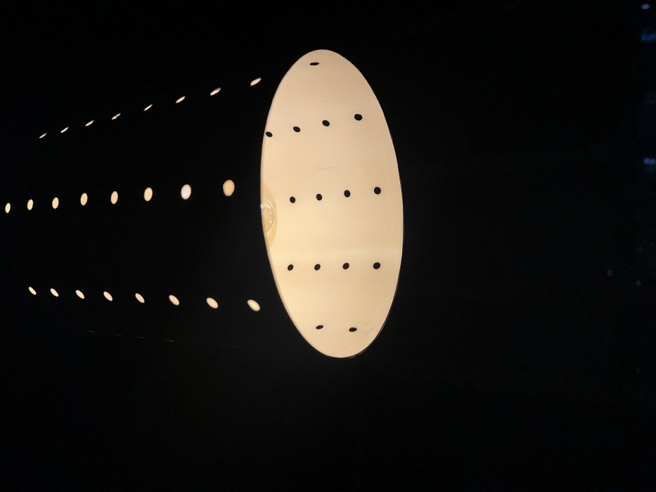A suspended, conical lamp is depicted from a low-angle perspective against an overwhelmingly dark background. The lamp's exterior is dark, featuring multiple vertical rows of evenly spaced circular perforations that allow points of light to emanate. Its interior is a light, cream-colored reflective surface, illuminated by a single incandescent bulb visible at its apex. The interior surface also exhibits dark circular marks corresponding to the perforations. The surrounding environment is characterized by profound darkness. Faint, indistinct blue light sources or reflections are barely discernible along the extreme bottom edge of the frame. No individuals, specific objects beyond the lamp, or direct interactions are present. The precise location within Dhaka, Bangladesh, is not visually identifiable in this image.