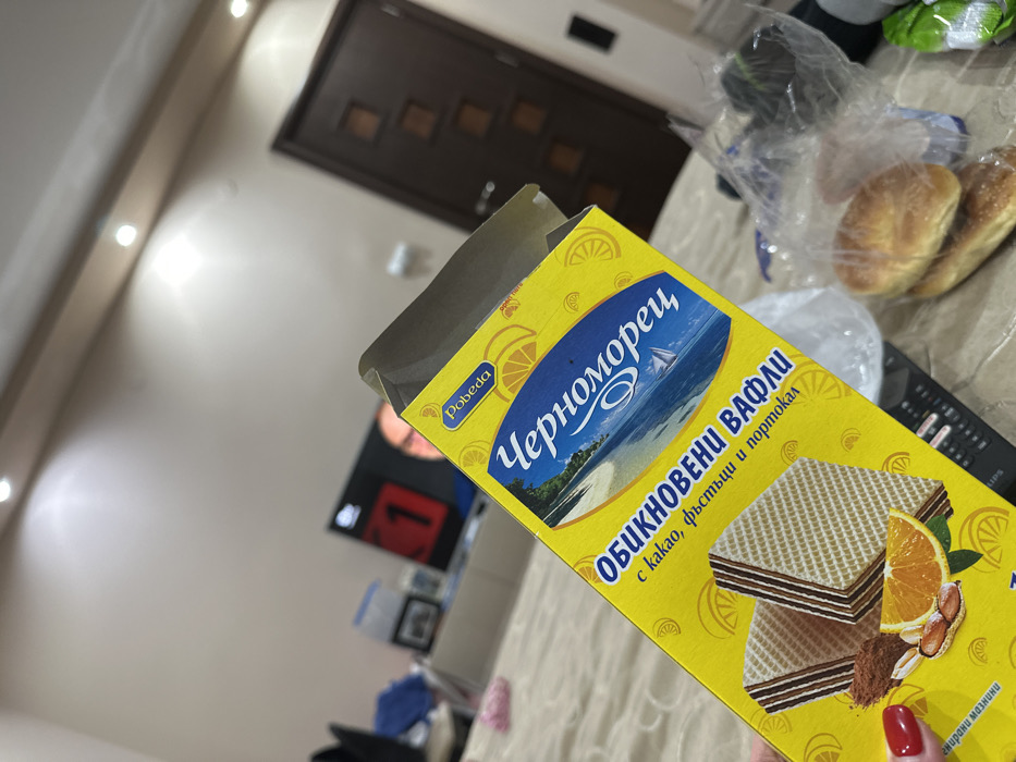 An indoor scene in Draginovo, Bulgaria, captured from a slightly elevated perspective, shows a hand with red-painted fingernails holding a yellow "Pobeda Черноморец" (Chernomorets) waffle box