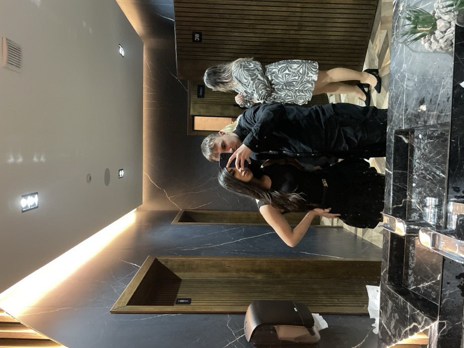 The scene depicts an interior view of an upscale public restroom in Kirkovo, Bulgaria, captured as a mirror selfie