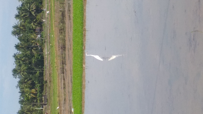 This image depicts an agricultural landscape in Cot Bagie, Indonesia. The foreground consists of a large, shallow body of standing water, likely a rice paddy, reflecting a light sky. A single white egret stands centrally in the water, facing left, with a distinct reflection visible beneath it. In the midground, a strip of vibrant green vegetation, consistent with young rice plants, extends horizontally across the frame, partially submerged in water. Beyond this green strip, another section of fallow or prepared muddy land is visible, with several smaller white birds scattered across it. The background is dominated by a dense treeline composed primarily of palm trees. Faint structures, possibly small buildings or dwellings, are discernible behind the treeline. The sky is a light blue with minimal cloud cover, indicating daylight conditions. No human figures are present.