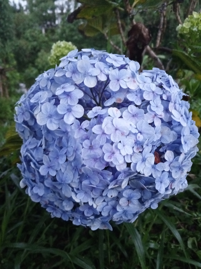 The image displays a large, spherical cluster of Hydrangea flowers, predominantly light blue with hints of lavender, observed outdoors in Catarman, Philippines. The flower head is composed of numerous small, four-petaled florets, some exhibiting minor surface variations. The foreground features dark green blades of grass. The background is softly blurred, revealing dense green foliage, with a lighter green plant visible to the mid-left and darker, possibly bare, tree branches in the upper right. No individuals, specific actions, or interactions are present. The scene is illuminated by natural, diffused light.