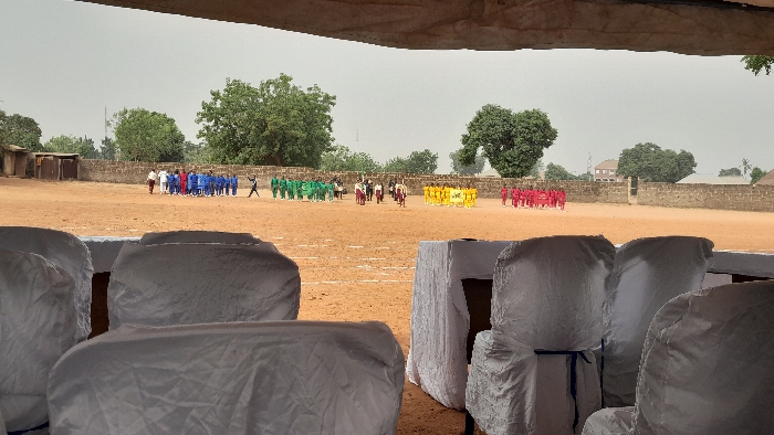 This image depicts an outdoor event on a reddish-brown dirt field in Lafia, Nigeria. The scene is viewed from under a brown overhead structure, with several chairs draped in white fabric occupying the foreground. On the dirt field, multiple groups of individuals are arranged in formations. From left to right, distinct groups of approximately 15-20 persons each are uniformly dressed in blue, green, yellow (with some holding a yellow banner), and red attire. A central group, consisting of 5-7 individuals, wears maroon and white uniforms; one person in this group holds a banner attached to a pole. Several adults in civilian clothing, including white shirts and dark trousers, are present among or near the formations. Faint white lines are visible on the dirt surface. The background features a low, light-colored brick wall. Beyond the wall, various green trees are visible, along with two small, simple structures featuring corrugated metal roofs on the far left. In the distant right background, a light-colored multi-story building with a red roof and an antenna tower are discernible against an overcast, hazy sky.