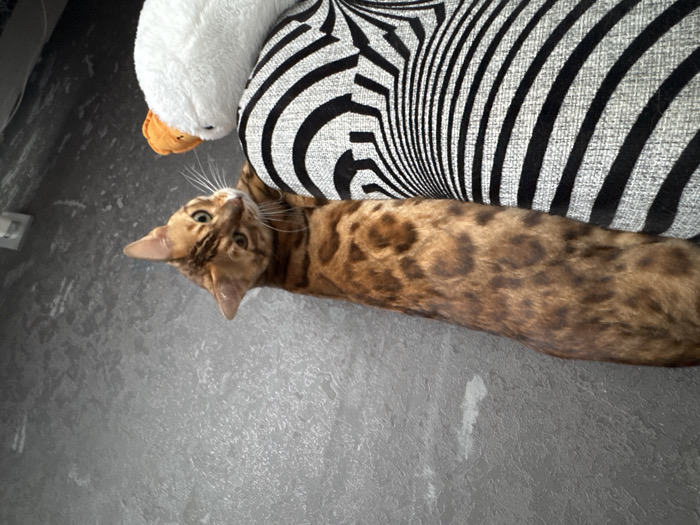 - "An indoor scene in Chusovoy, Russia, features a Bengal cat resting horizontally on a piece of furniture" by FM-qGpE52, licensed under CC BY 4.0