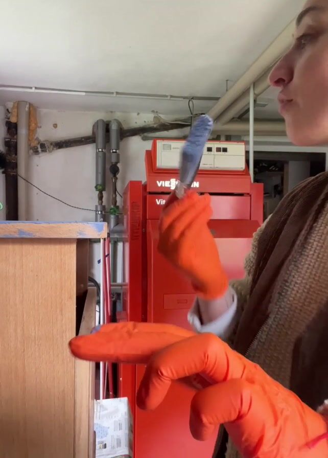 A woman wearing orange gloves and a brown vest is painting a wooden cabinet in what appears to be a basement. Behind her is a large red Viessmann boiler and some exposed pipes and wiring on the wall. The woman has her hair pulled back and is using a paintbrush to apply a light blue paint to the top of the cabinet. The basement has a low ceiling and appears utilitarian in nature.