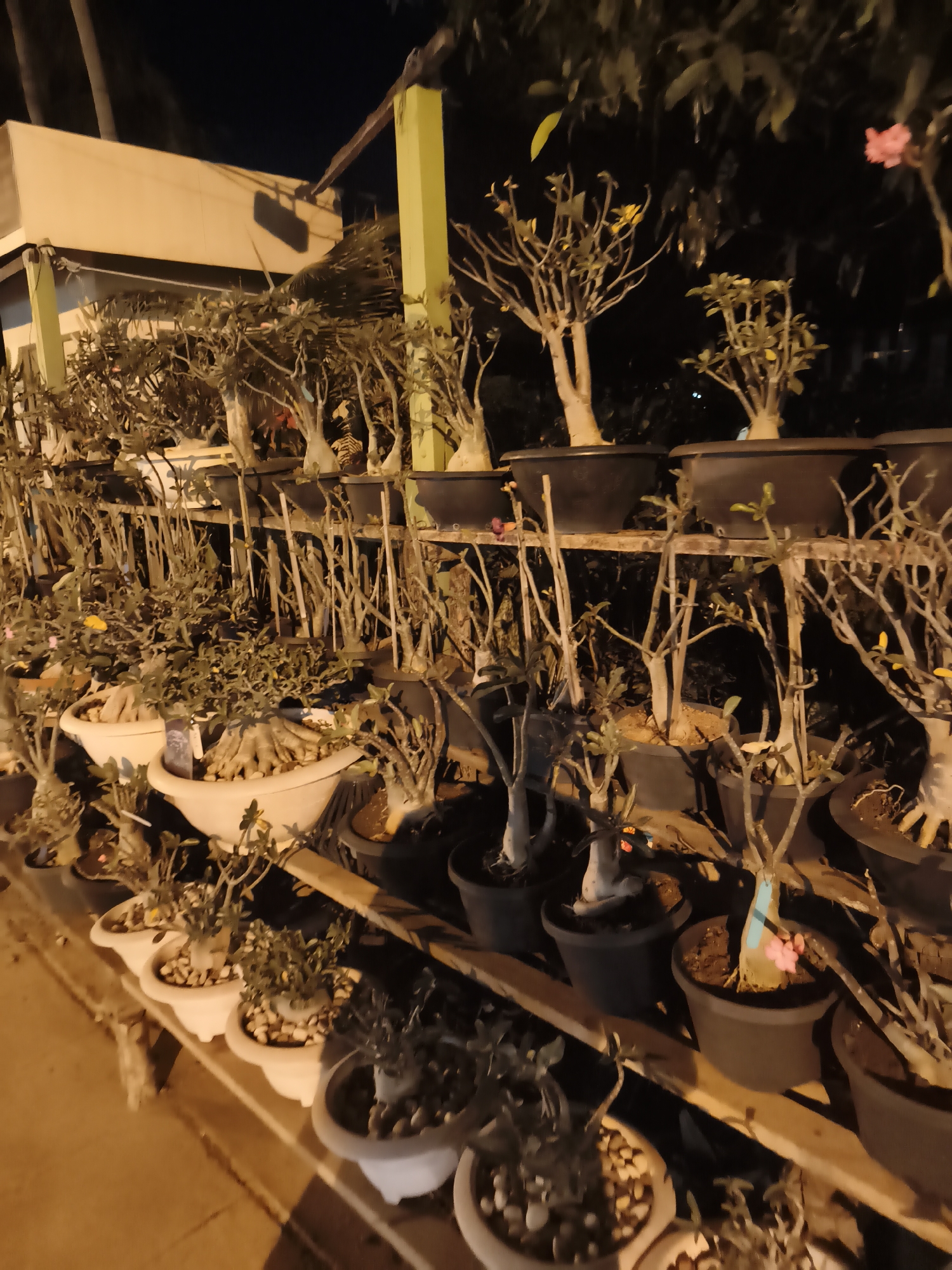 collection of potted desert rose plants (Adenium obesum) displayed on tiered wooden shelves outside a building. The location is in Baan Bo Phut, Thailand. The building has a light-colored facade with a dark awning and green support pillars. The plants are in various stages of growth, some with leaves and flowers (pink and yellow), others mostly bare. The pots are predominantly black and white. The photograph was taken at night. The sidewalk is visible in the foreground. The pots are arranged on two levels.