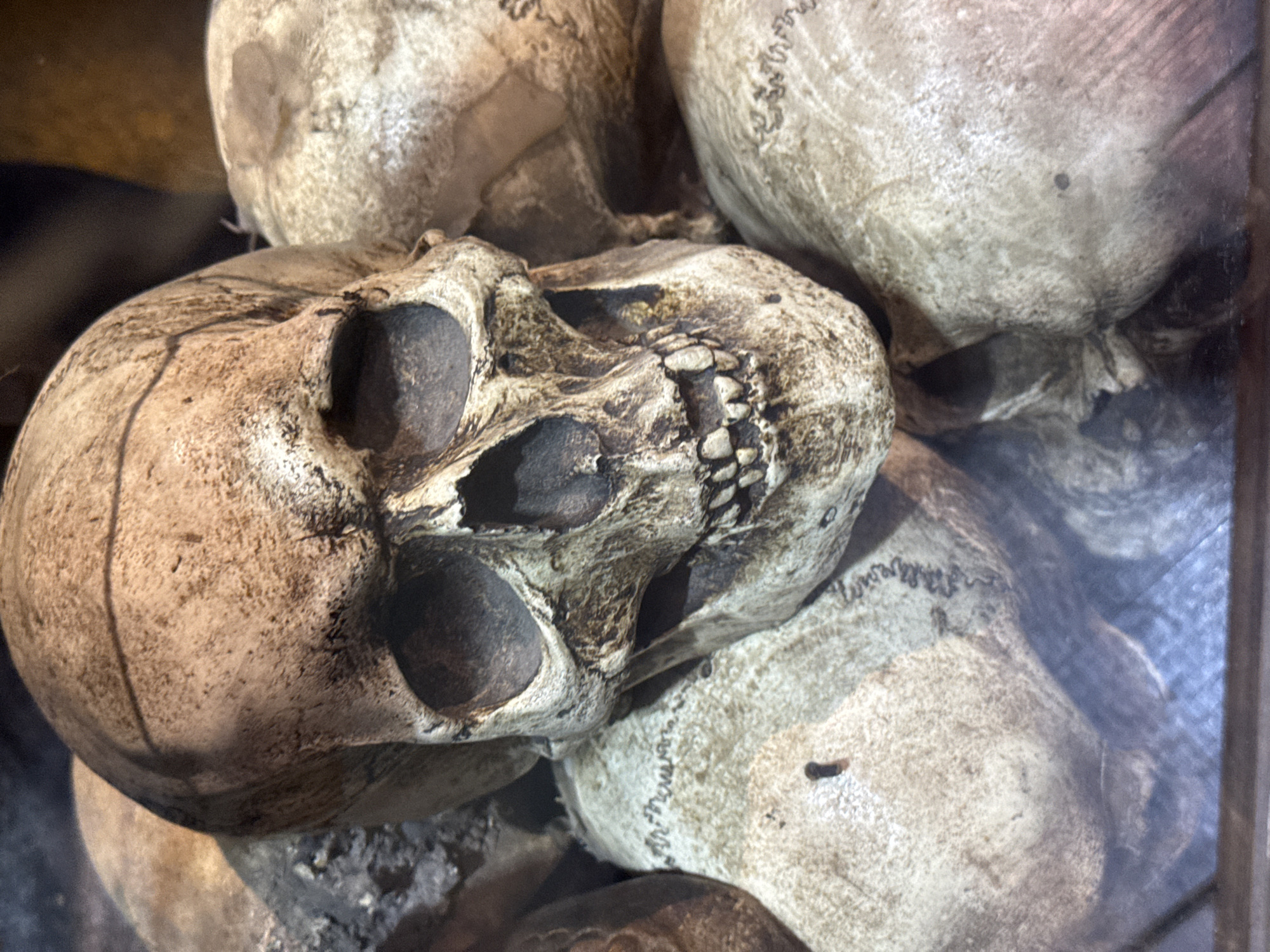 The image displays a close-up, slightly elevated view of multiple human skulls piled together