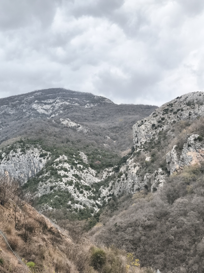 The image presents a mountainous landscape in Mišići, Montenegro, under a heavily overcast sky filled with light grey clouds. The scene is dominated by steep, rugged mountains and a deep valley or gorge. Mountain slopes are primarily covered with deciduous trees in a dormant, leafless state, appearing grey and brown, interspersed with patches of evergreen vegetation and extensive exposed light-grey rock formations. A prominent rock cliff face is visible on the right side of the valley. In the lower left foreground, a steep embankment shows dry brown vegetation and a partial metal mesh, likely a rockfall barrier. Several dark, thin horizontal lines, consistent with power lines or cables, traverse the valley in the mid-ground, spanning between the slopes. No human subjects, buildings, or vehicles are present.