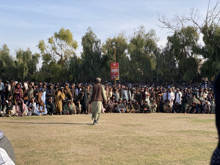 This image depicts a large outdoor gathering in Kandahar, Afghanistan