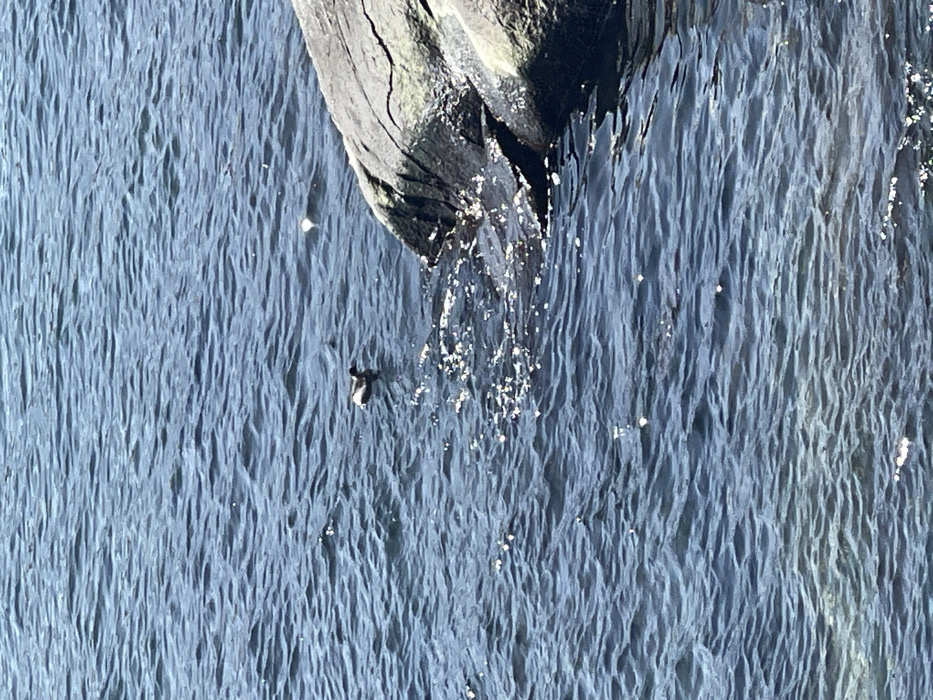 The scene depicts a segment of water, likely the Black Sea, in Sozopol, Bulgaria, illuminated under natural sunlight. The water surface is textured with numerous small ripples, and several bright specular reflections indicate direct sunlight. A solitary dark-feathered bird, possibly a duck or a similar aquatic species, is observed swimming towards the left within the middle ground of the frame. The bird exhibits a lighter colored patch on its side or breast. To the right, a large, irregularly shaped rock formation, dark grey in color with visible fissures and some lighter encrustations, protrudes from the water, partially submerged. Small waves lap against the visible portion of the rock. No human figures or man-made structures are present within the frame.