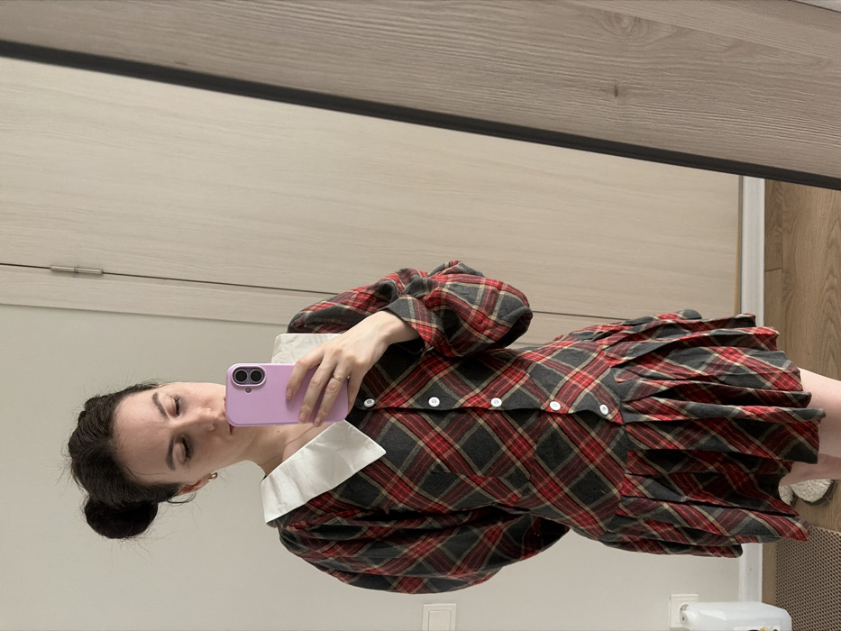 A female individual is depicted indoors, taking a mirror selfie in Novoe Devyatkino, Russia. She holds a light purple-cased smartphone in her right hand, positioned over the lower part of her face, with her gaze directed downwards. Her dark hair is styled in a bun on top of her head, and a gold-colored ring is visible on her left ring finger. She wears a long-sleeved dress featuring a red, black, and tan plaid pattern. The dress has a large white collar, puffed sleeves, and a pleated skirt. White buttons are visible down the front bodice. The background, reflected in the vertical full-length mirror, shows a light-colored wall on the left, a light wood-paneled door with a silver hinge on the right, and light wood flooring with a dark mat and a white object (possibly a container) on the far left.