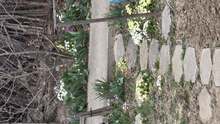 The image displays a garden scene in Belitsa, Bulgaria, viewed from a slightly elevated perspective. A path composed of multiple hexagonal concrete stepping stones extends from the bottom foreground towards the upper center, partially obscured by vegetation on either side. Bare soil and sparse green grass constitute the immediate ground cover. Clusters of blooming primroses, predominantly white and light yellow, along with some magenta/purple varieties, are situated adjacent to and between the stepping stones. In the midground, a horizontal concrete border or raised bed separates the lower garden area from an upper section. Above this border, numerous green leafy plants, likely emerging bulbs, are arranged alongside additional clusters of white, light yellow, and magenta primroses. A clump of green foliage with small yellow flowers is visible to the left of the stepping stone path, near the concrete border. Two slender, dark-colored stakes are positioned vertically; one on the right edge, partially obscured, and another on the left, angled inwards. The background features a leafless deciduous tree with multiple slender branches centrally positioned. Behind the tree and other bare vegetation, a dark-colored wire mesh or chain-link fence is discernible. Beyond the fence, a less defined background suggests further structures or dense, dormant foliage. The scene is illuminated by diffuse daylight, casting no distinct shadows. No individuals or active interactions are present in the frame.