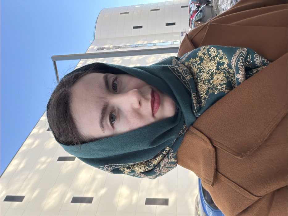 A woman with fair skin, dark hair, and blue eyes is depicted from the chest up, looking directly into the camera. She wears a dark emerald green headscarf with gold floral and patterned embroidery, covering her hair and wrapped around her neck. Her lips are painted with red lipstick. She is also wearing a brown or camel-colored coat. The background features two modern buildings with light-colored facades under a clear blue sky. The building on the left is rectilinear with several dark, vertical rectangular windows. The building on the right has a curved section with similar windows. Patches of snow are visible on the ground, suggesting a cold season. Several vehicles are parked in the background. A modern street light post is also visible. The scene is located in Yanino-1, Russia.