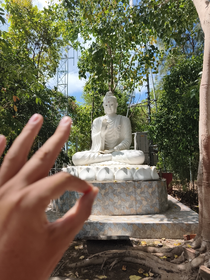 A serene white Buddha statue sits atop a lotus-shaped base, centered within a lush, green outdoor setting. An unseen tree towers over the right side, and a hand is in the foreground, framing the scene with the "OK" sign. Behind the statue, foliage mixes with glimpses of a metal transmission tower, suggesting a location that blends nature and technology. The statue’s placement and the surrounding greenery evoke a sense of peace and contemplation.
