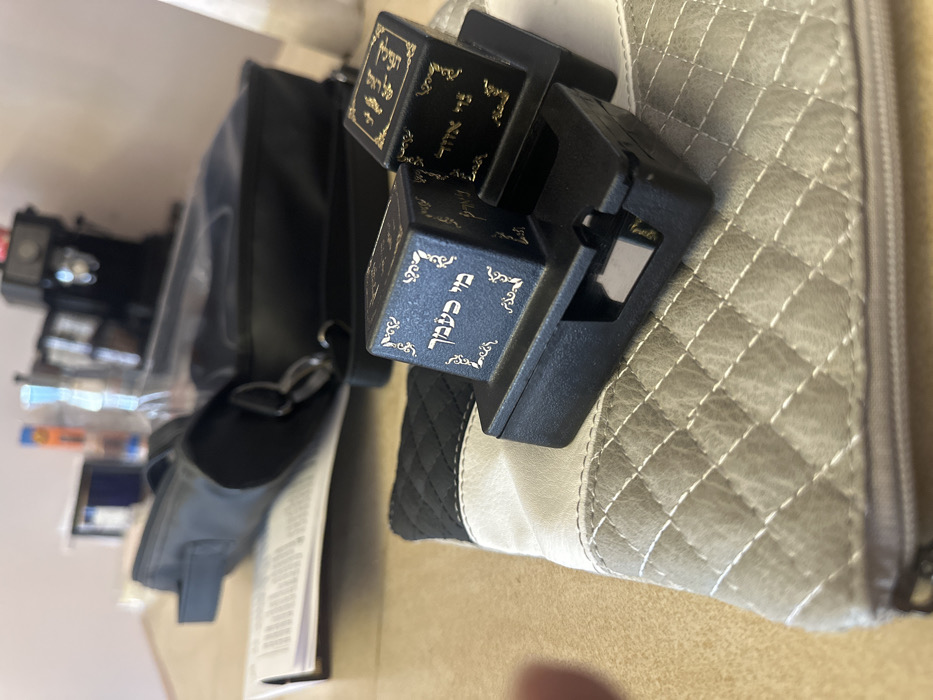 A black, rectangular object rests on a beige quilted purse. The object has Hebrew writing in gold ink on its faces. A black purse and various items sit blurred in the background, including a camera. The objects are positioned on a tan surface. The perspective makes the objects appear to be on their side.