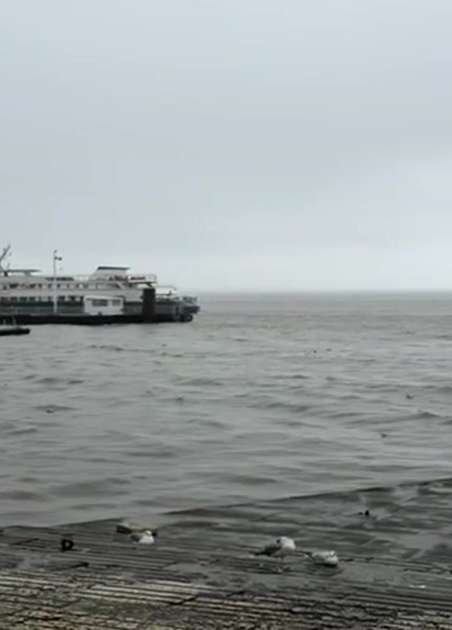 river scene on a gray, overcast day. In the foreground, stone steps lead down to the water, with several seagulls perched on them. The water is choppy and gray, with some whitecaps. In the mid-ground, there is a ferry docked to the left. Moving further into the water, a ferry and large cargo ship pass by in the distance. A marker post in the river is visible to the right. The sky is a solid, pale gray color.