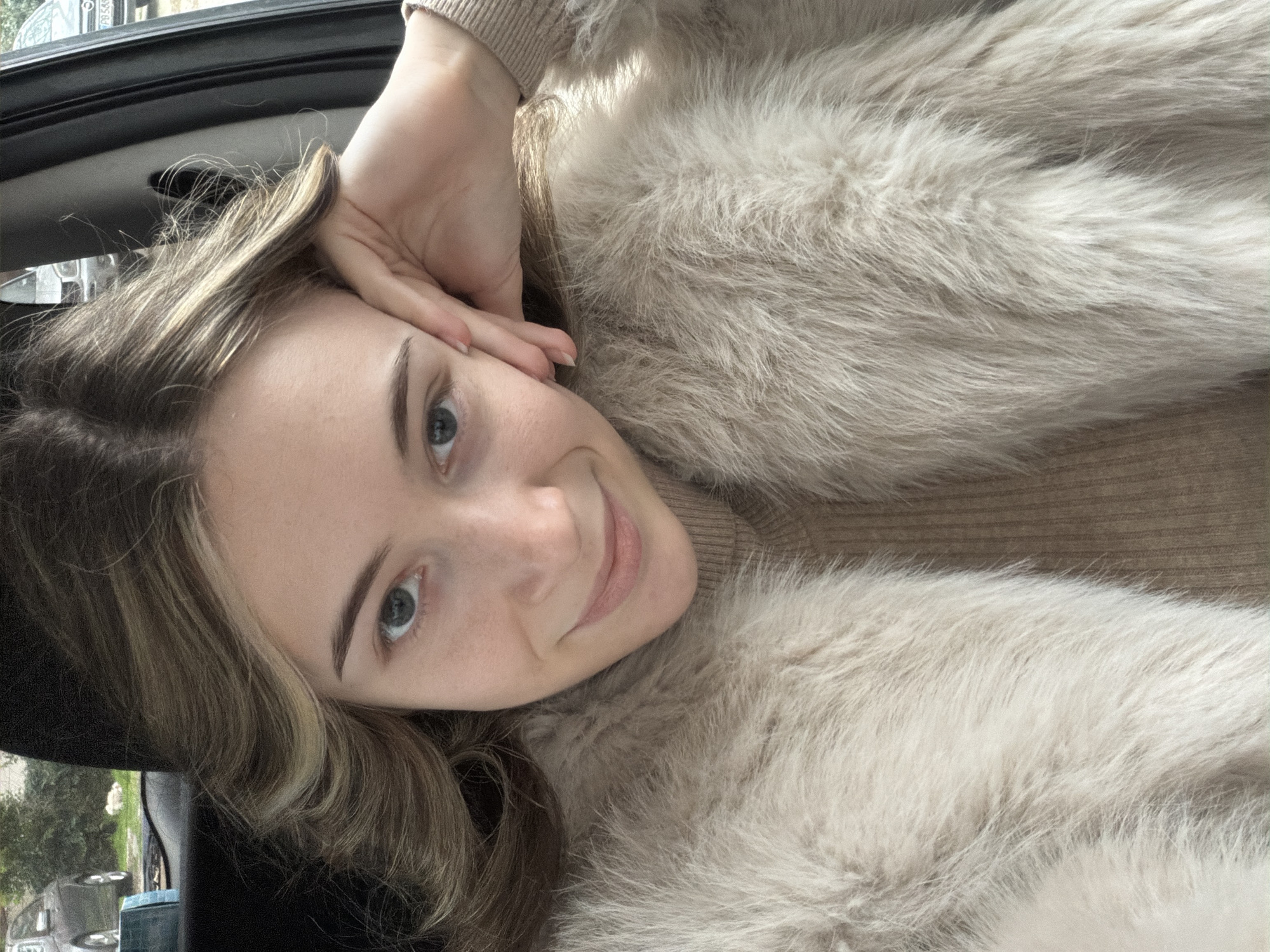A woman is posing for a selfie. She has blond hair and blue eyes, and is wearing a tan sweater and a fur coat. She is in a car, and through the window is a view of a street with cars and trees. It is unclear if the location is Plovdiv, Bulgaria.