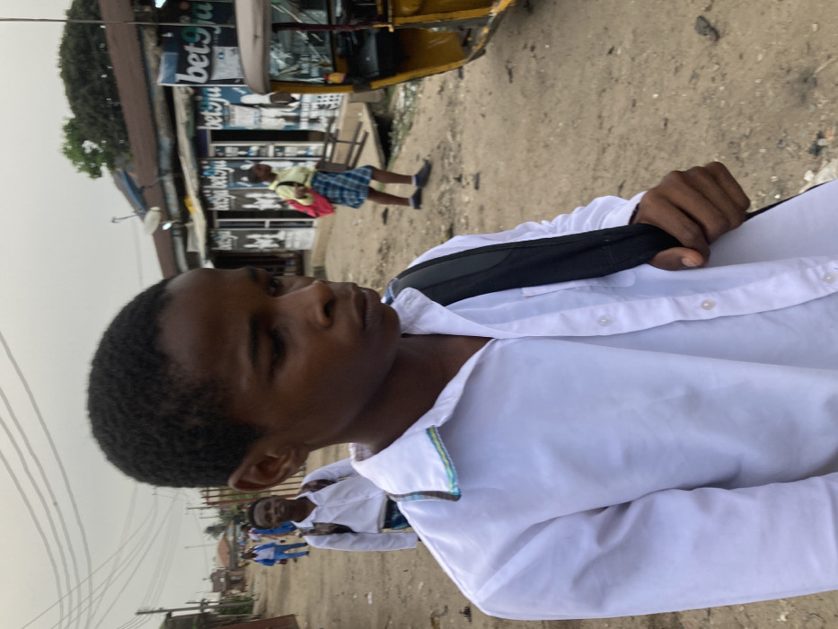 A young man wearing a white button-down shirt and a black strap looks to the left. He is in an outdoor setting, with a yellow vehicle and a building advertising "bet9ja" in the background. Another person can be seen walking in the background, wearing a yellow top and a blue skirt. The setting appears to be a street or roadside with other people and buildings visible in the distance.