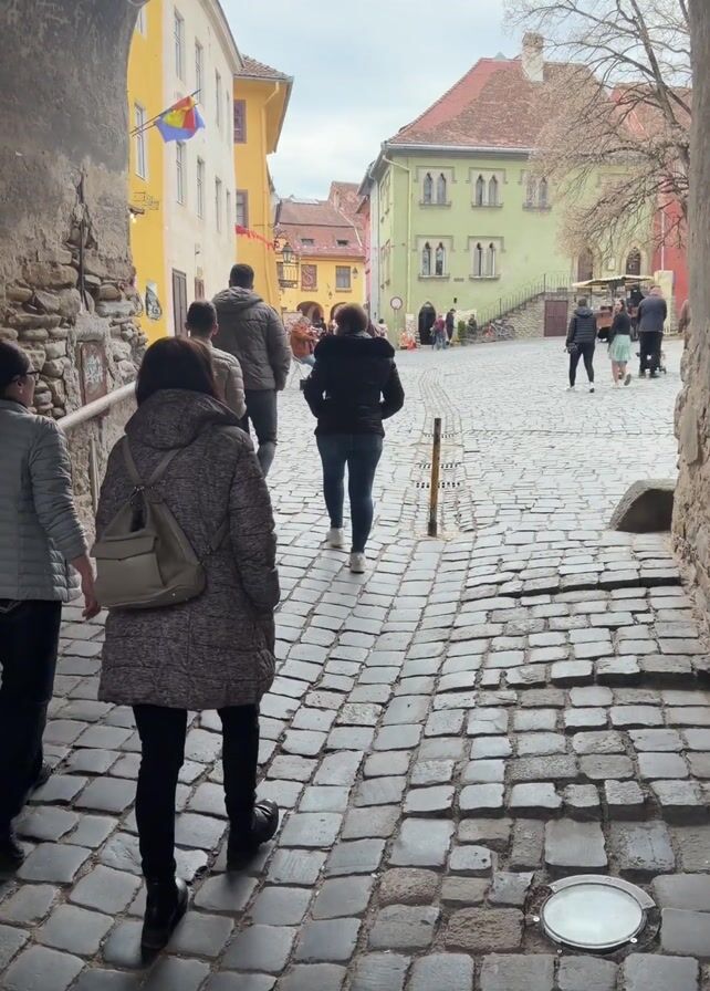 A group of people are walking out of a stone archway onto a cobblestone square in what appears to be a European town. The buildings surrounding the square are painted in various colors, including yellow, green, and red. Several people are strolling around the square, some pushing strollers. The sky is overcast.