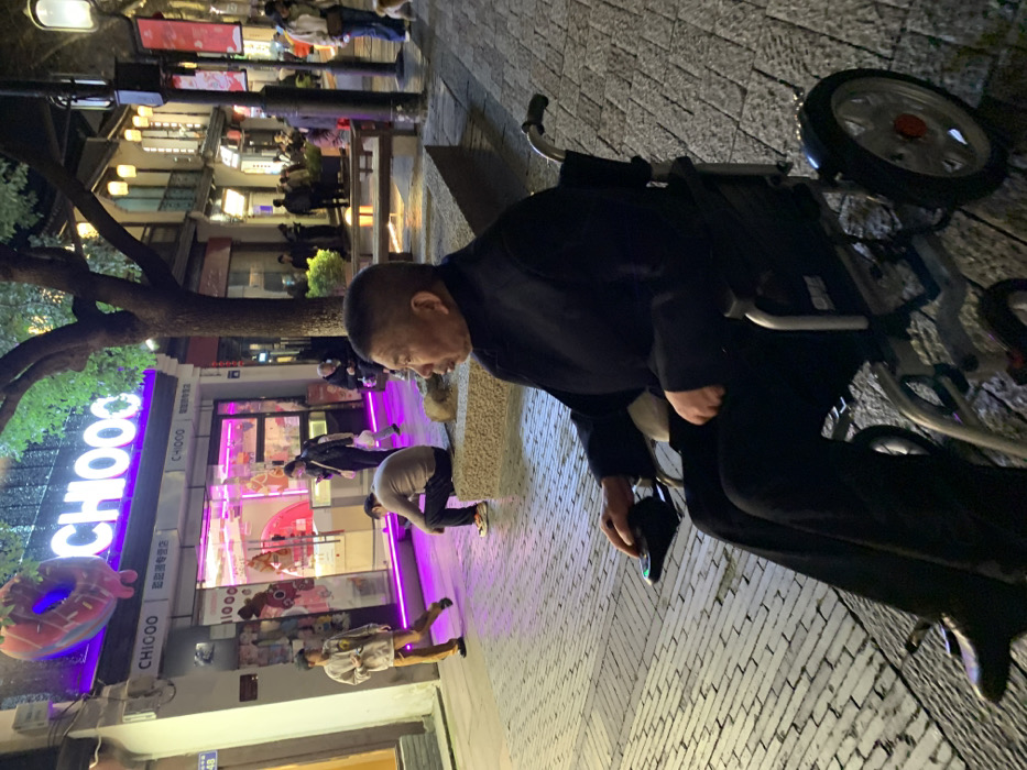 The image depicts a nighttime scene on a commercial pedestrian street in Shangcheng District, China. In the foreground, an elderly East Asian male, dressed in a dark jacket and trousers, is seated in a silver-framed electric wheelchair, oriented towards the right side of the frame. His right hand rests on the joystick control panel of the wheelchair. The street is paved with grey, irregularly patterned paver stones. In the mid-ground to the left, a store named "CHIOOO" is prominently visible with large, illuminated purple signage and a decorative, oversized donut hanging above the text. The store's interior is brightly lit with pink and purple light, showcasing merchandise behind a glass facade. To the left of the store, a young East Asian male in a light-colored graphic shirt and tan trousers walks to the right, looking down at a device in his hand. Center-left, an adult East Asian male sits on a low stone barrier, facing left, wearing a light-colored long-sleeved shirt and dark trousers. Another adult East Asian female walks rightward in the center-right mid-ground, carrying a white bag. Further down the street, more pedestrians are visible under the illumination of traditional-style streetlights and lanterns, typical of a bustling commercial area. Buildings with traditional architectural elements, including dark wood and multiple stories, line the street. A tree with sparse foliage stands in the center-mid ground. The overall environment is well-lit by a combination of storefront lights, street lamps, and decorative lanterns, suggesting an active evening atmosphere.
