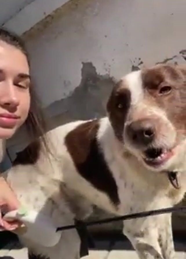 A young woman with dark hair and light skin is holding a white dog waste bag dispenser in her left hand. She is smiling slightly at the camera. Next to her is a medium-sized dog with white and brown spots. The dog has a black leash attached to its collar. The dog looks to the side with its mouth slightly open. The background is a concrete wall and the scene appears to be outdoors.