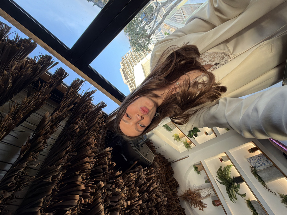 A female individual with long brown hair, wearing a light-colored blazer over a lace-trimmed top and a star-shaped pendant necklace, is captured in a mid-shot selfie, making a puckered lip expression. The indoor environment features a ceiling covered with dried, textured plant material, resembling thatch, and a mounted black Bose speaker. A white wall displays multiple recessed, illuminated shelves holding various potted plants and decorative items, including ferns, succulents, and a vase with dried foliage and white pebbles. Through a large window with black frames, a clear blue sky, a multi-story building with balconies, and green trees are visible. The scene is located in Petrovac centar, Montenegro.