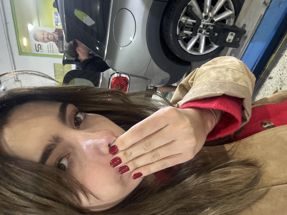 A woman with long brown hair and red nail polish covers her mouth. She wears a tan jacket over a red shirt. Behind her, a silver car is being serviced, with a wheel alignment device attached to the front tire. A mechanic works on the car near the tail light. A poster with a man's face is visible on the wall in the background. The image appears to be taken inside a garage or auto repair shop.