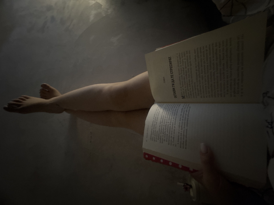 An indoor, dimly lit image captures a first-person perspective of a subject's lower body and hands. The subject's bare legs are elevated and crossed at the ankles against a textured, light grey wall. A hand, with manicured fingernails, holds an open paperback book. The book's left edge features a red spine with white polka dots. The text visible on both pages is in Bulgarian; a prominent heading on the right page reads "ОСТАВИ ГИ ДА ТЕ СТРЕСИРАТ" (Leave them to stress you out). A faint light source illuminates the upper right portion of the wall. A white, cylindrical object is partially visible on a surface to the left of the book. The scene suggests a relaxed state, likely in a private residence within Sofia, Bulgaria, indicated by the Bulgarian language text. No specific landmarks or precise address are discernible.