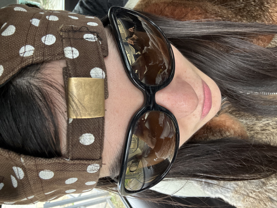 The scene depicts an individual captured from the forehead to the upper chest, situated within a vehicle in Montreuil, France. The person wears a brown cap with white polka dots, positioned backward, revealing a brass-colored metallic buckle at the rear adjustment strap. Long, dark hair, showing some grey strands, falls over the shoulders. Black, cat-eye style sunglasses with reflective lenses cover the eyes, with only the bridge of the nose and lips, adorned with light pink lipstick, visible below. The upper body is clad in a brown, fur-like jacket, secured by a visible silver zipper or chain. Reflections in the sunglasses show a distorted image of the vehicle's interior, including a hand holding a smartphone or camera, and a blurry outdoor background featuring what appears to be a grey fence or barrier.