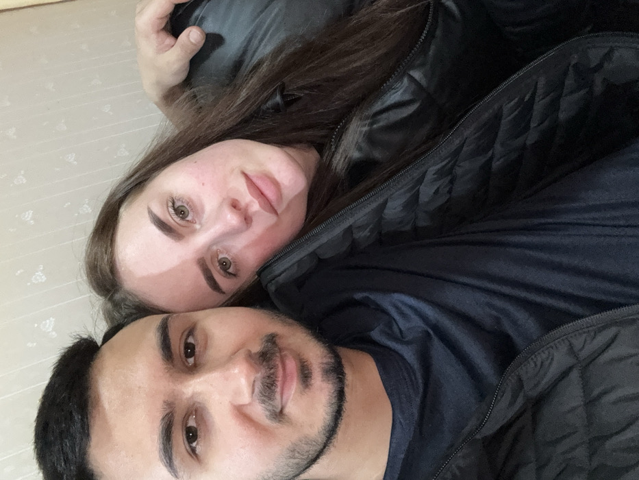 A close-up, indoor photograph captures two individuals, a male and a female, in a head and upper torso composition. The male, positioned on the left, has dark hair, a short beard, and a light mustache. He is wearing a dark blue crew-neck shirt beneath an open black quilted vest. His eyes are dark brown, and he exhibits a slight smile while looking directly forward. The female, situated to the right, has long, straight dark brown hair and light-colored eyes. She is wearing a black quilted jacket, zipped partway. Her head rests against the male's left shoulder or chest. A prominent shadow bisects her face vertically, falling across her right eye, nose, and mouth, while her left side is illuminated. Her expression is neutral as she looks towards the camera. A male hand, consistent with the individual on the left, is visible resting on the female's upper left shoulder. The background consists of a light-colored interior wall with a subtle, textured, or embossed pattern. The scene is located in Fowlis Easter, United Kingdom.