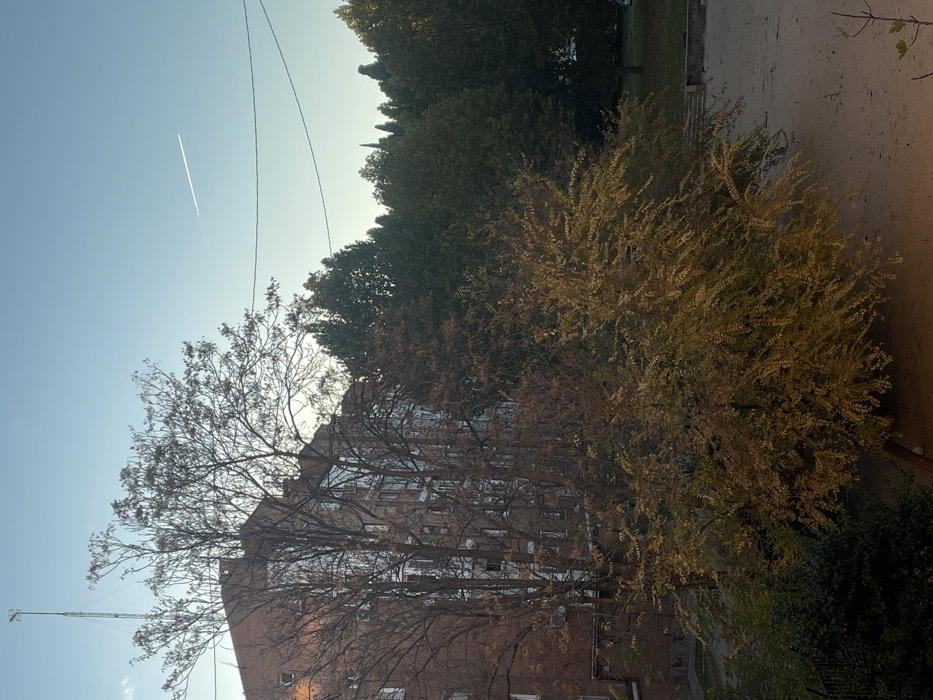 A building is partially visible through bare tree branches, with a taller green tree obscuring part of it