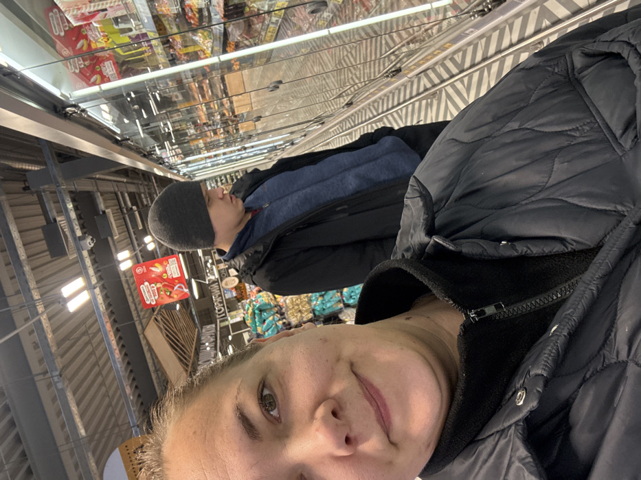 The image depicts the interior of a supermarket aisle in Dmitrov, Russia. In the foreground, a light-skinned female individual is captured from the chest up, taking a selfie. She has dark hair, a slight smile, and is wearing a black quilted jacket over a black zipped fleece. To the right and slightly behind her, a light-skinned male individual is observed facing right, away from the camera, and looking into a long row of glass-fronted refrigerated display cases. He is dressed in a dark grey beanie, a dark blue zip-up fleece, and a black jacket. The refrigerated display cases line the right side of the aisle, containing various packaged food items. The glass doors of these cases reflect portions of the store's interior. The floor of the aisle features a pattern of light and dark diagonal stripes. In the background, behind the male figure, shelves stocked with packaged goods are visible. Overhead, the ceiling structure is exposed, revealing metal framework, ventilation ducts, and rectangular fluorescent light fixtures. Hanging from the ceiling are signs, including a red rectangular sign with white Cyrillic text and another sign that reads "ГОРЯЧИЙ" (GORYACHIY), indicating a "Hot" food section. The scene is brightly illuminated by artificial overhead lighting.