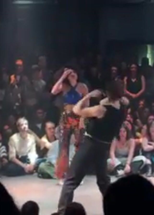 Two dancers are performing in a dark space surrounded by a large audience sitting on the floor. The dancer on the left is wearing a blue top and multi-colored sequined pants, while the dancer on the right is wearing a black sleeveless top and black pants. The audience is dense and close to the performance area, with many people looking towards the dancers. A spotlight shines on the dancers, highlighting them against the darker background of the audience and venue.