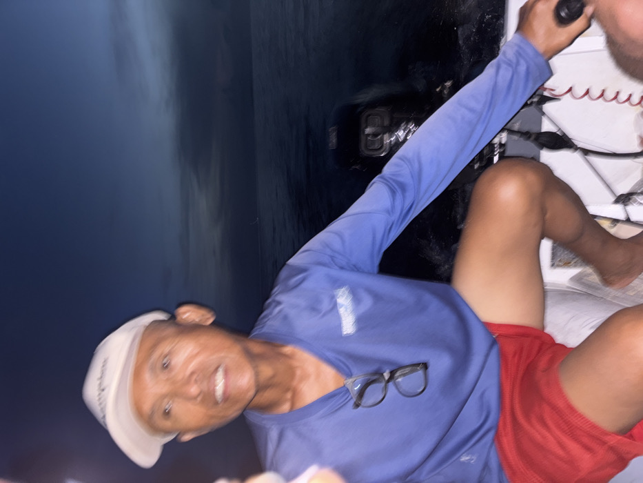 An adult male is operating a motorboat on open water in General Luna, Philippines, under low light conditions, indicative of dusk or dawn. The man, appearing to be of Asian descent and middle-aged, is positioned on the boat's port side. He wears a light-colored baseball cap, a long-sleeved blue performance shirt with an unidentified logo on the left chest, and red shorts. Black-framed eyeglasses are suspended from his shirt collar. He is barefoot. His right hand grasps a black tiller handle connected to a red coiled wire, which controls an outboard motor visible at the stern of the boat. The motor is actively displacing water, generating a wake. The man's face, slightly blurred, is oriented forward and slightly to the right, exhibiting a slight open-mouthed expression. The environment consists of dark blue-grey water extending to a horizon line under a similarly colored sky with indistinct cloud formations. A faint, small object is visible on the distant water surface.