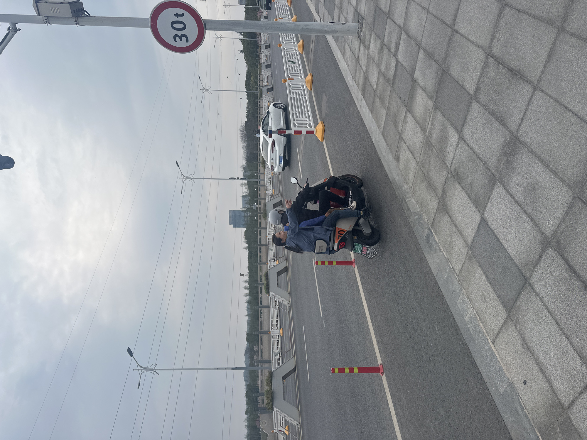 The image displays an outdoor daytime scene on a multi-lane road in Jiangning District, Nanjing, Jiangsu Province, China, under an overcast sky. Two individuals are riding a dark electric scooter, bearing the license plate '苏 A 2A605', in the foreground. The driver, wearing a grey helmet and dark clothing, operates the scooter. Seated behind the driver is a female passenger with dark hair tied in a ponytail, wearing a blue jacket and blue pants, looking slightly forward and to the right. To the immediate right of the scooter is a grey tiled sidewalk. The scooter is positioned on a paved lane bordered by red and yellow striped bollards on its left. Further left, a white Buick sedan, with a partially visible '苏 A' license plate, is moving away from the viewer in the adjacent lane. A white and orange temporary barrier separates this lane from the far-right side of the main road, where a dark vehicle is partially visible. On the right side of the image, a utility pole features a circular red-bordered sign indicating a '30t' weight limit and a surveillance camera mounted above. Multiple modern streetlights with double arms and numerous overhead utility lines span across the scene. In the background, beyond the main road, concrete barriers with integrated planters, trees, and a distant tall building are visible.